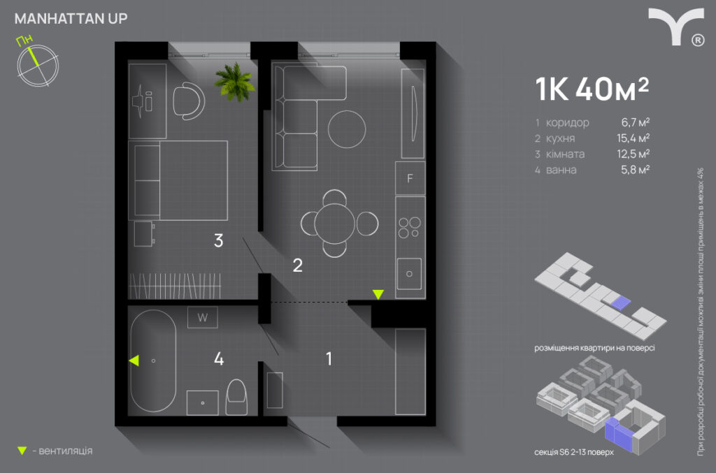 Однокімнатні квартири традиційно є найпопулярнішим форматом для інвестування. Вони мають оптимальне співвідношення ціни, площі та попиту на ринку як для продажу, так і оренди. Для прикладу розглянемо однокімнатну квартиру площею 40 м² у секції S6 ЖК Manhattan UP.