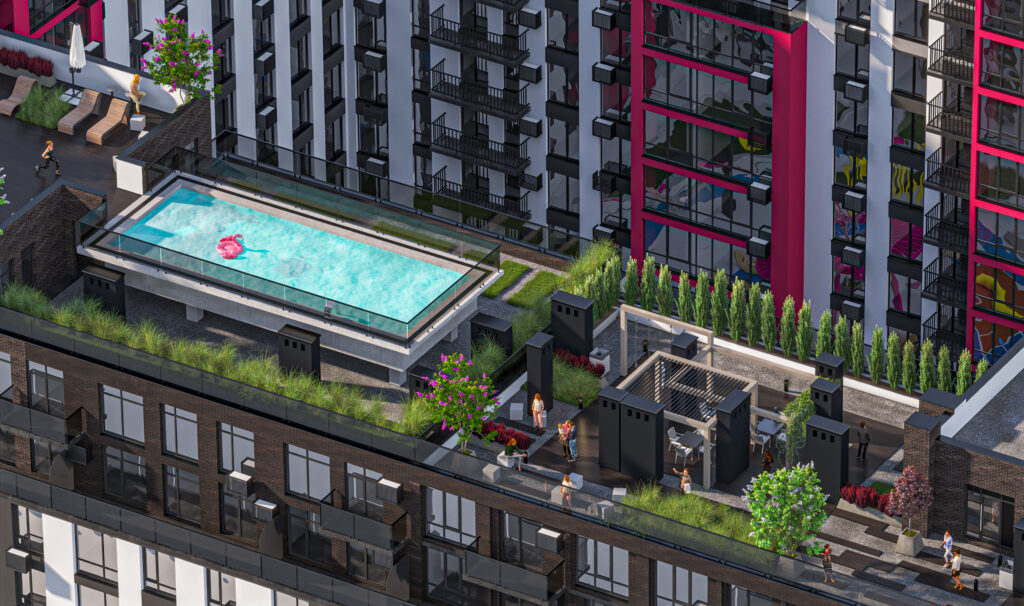 Це перший ЖК у місті, в якому передбачені басейни на даху будинків. Мешканці зможуть релаксувати після робочого дня, насолоджуючись відпочинком під відкритим небом із краєвидами на місто, просто піднявшись ліфтом зі свого поверху на дах.