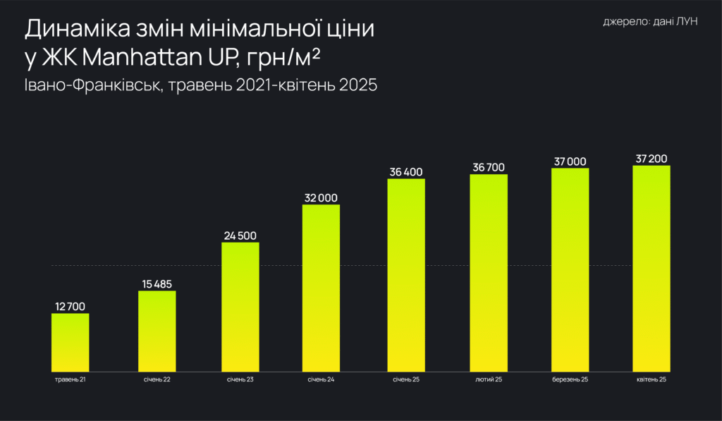 З моменту старту продажів у травні 2021 року до квітня 2025 року вартість квадратного метра зросла з 12 700 грн до 37 200 грн. Це приріст на 192,9% — майже втричі.